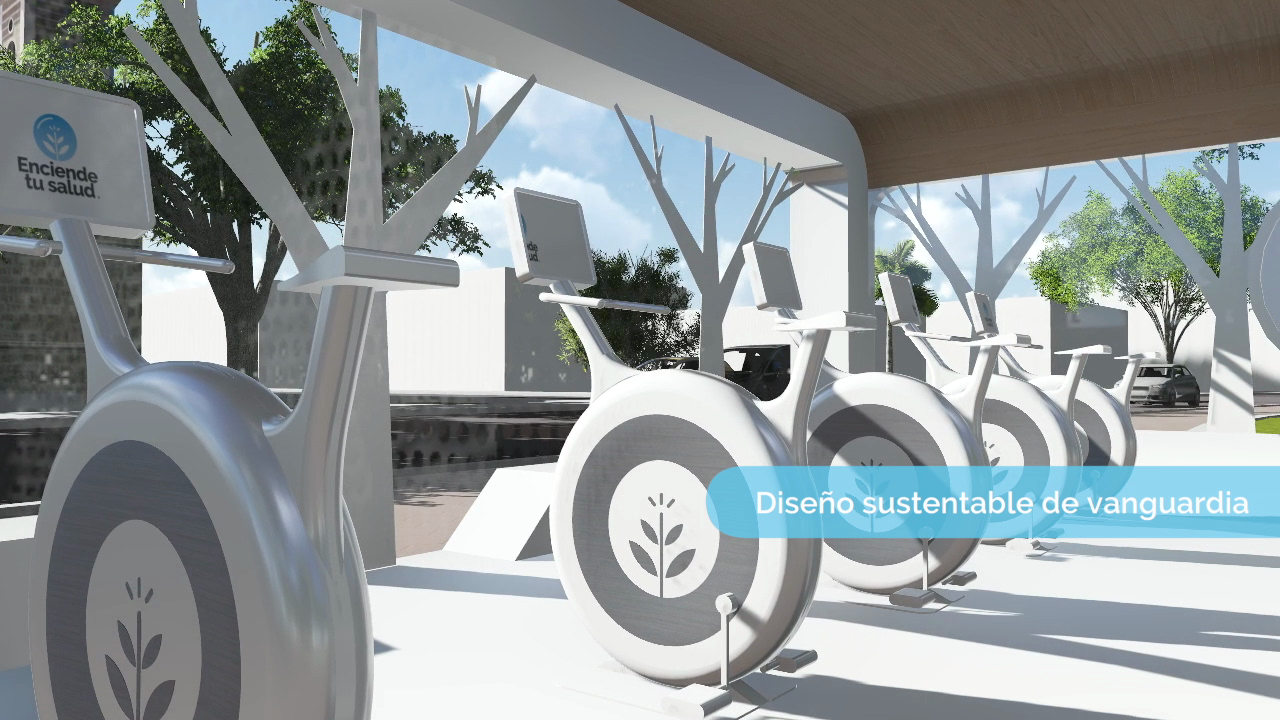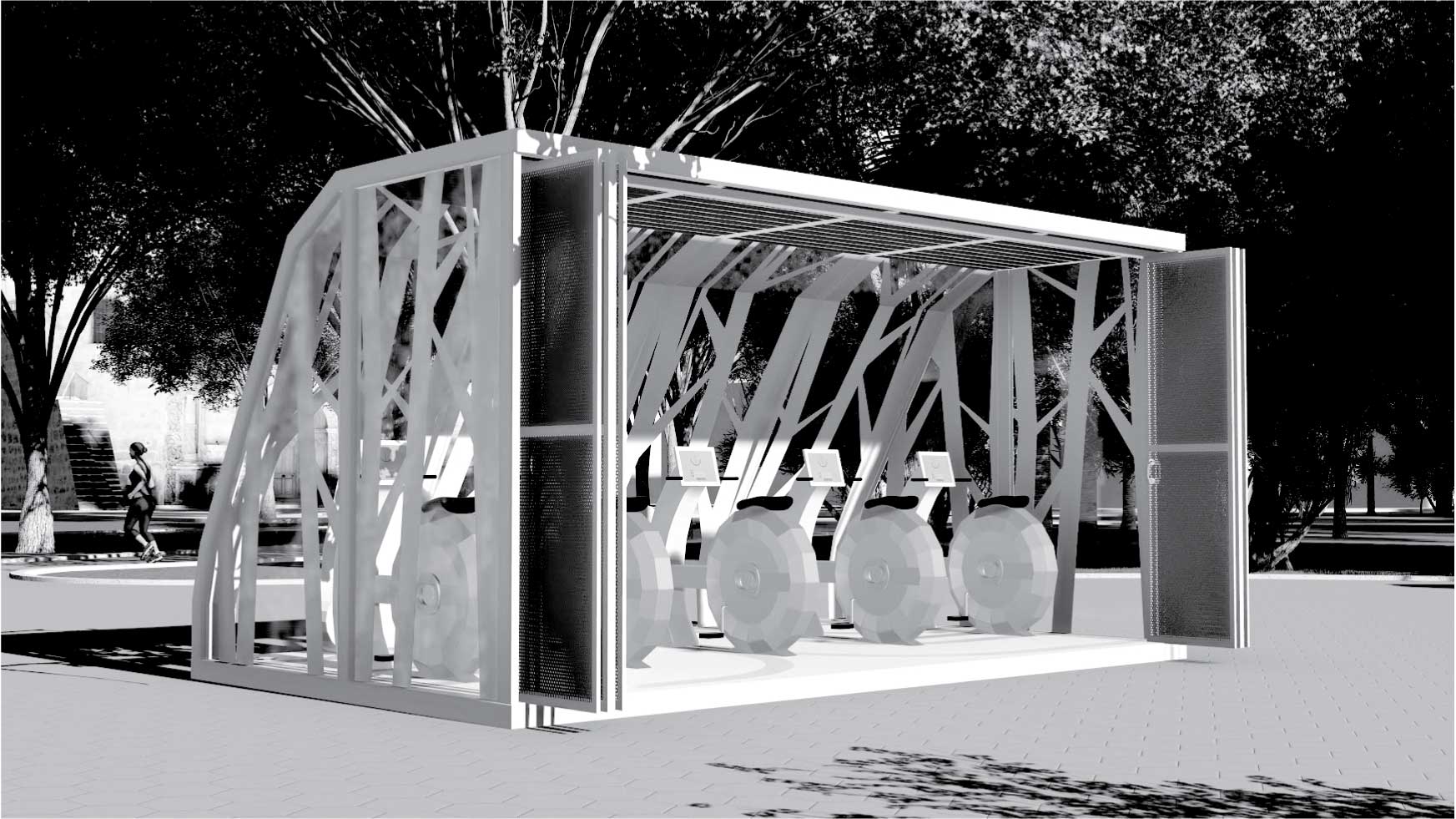 Módulo con estructura tecnológica de diseño único, atractivo y amigable con el medio ambiente de uso rudo con 5 bicicletas de diseño industrial y tecnología propia.